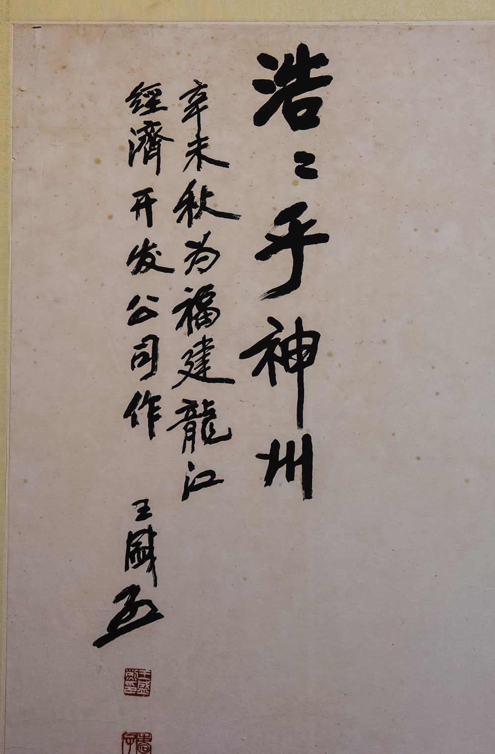 《浩浩乎神州》是著名艺术家和美术教育家王盛烈先生(1923.11-2003.11),艺术巅峰期(1991年)的宏篇巨制(237×524cm)。在这幅孤品代表作中,作者以代表中华民族精神的万里长城为主线,大胆泼墨挥毫,在波澜壮阔的浩浩天宇间,雄伟长城绵延盘亘在崇山峻的之上,展现中华民族不屈不挠,坚忍不拔的奋斗品格“大鹏一日同风起,扶摇直上九万里。”在峰壑云海中两只雄鹰展翅盘旋,在整个画面中更是画龙点晴之笔。通览整幅画作,让观者心灵为之震撼,不由得想起古人“滚滚长江东似水,浪花淘尽英雄”的感叹,不由得想起毛泽东“江山如此多娇”,“数风流人物,还看今朝”的豪迈词句,从而激发起中华儿女的蓬勃朝气和昂扬斗志,投身到中华民族伟大复兴的滚滚大潮中,诏示浩浩神州必将永远屹立于世界民族之林。